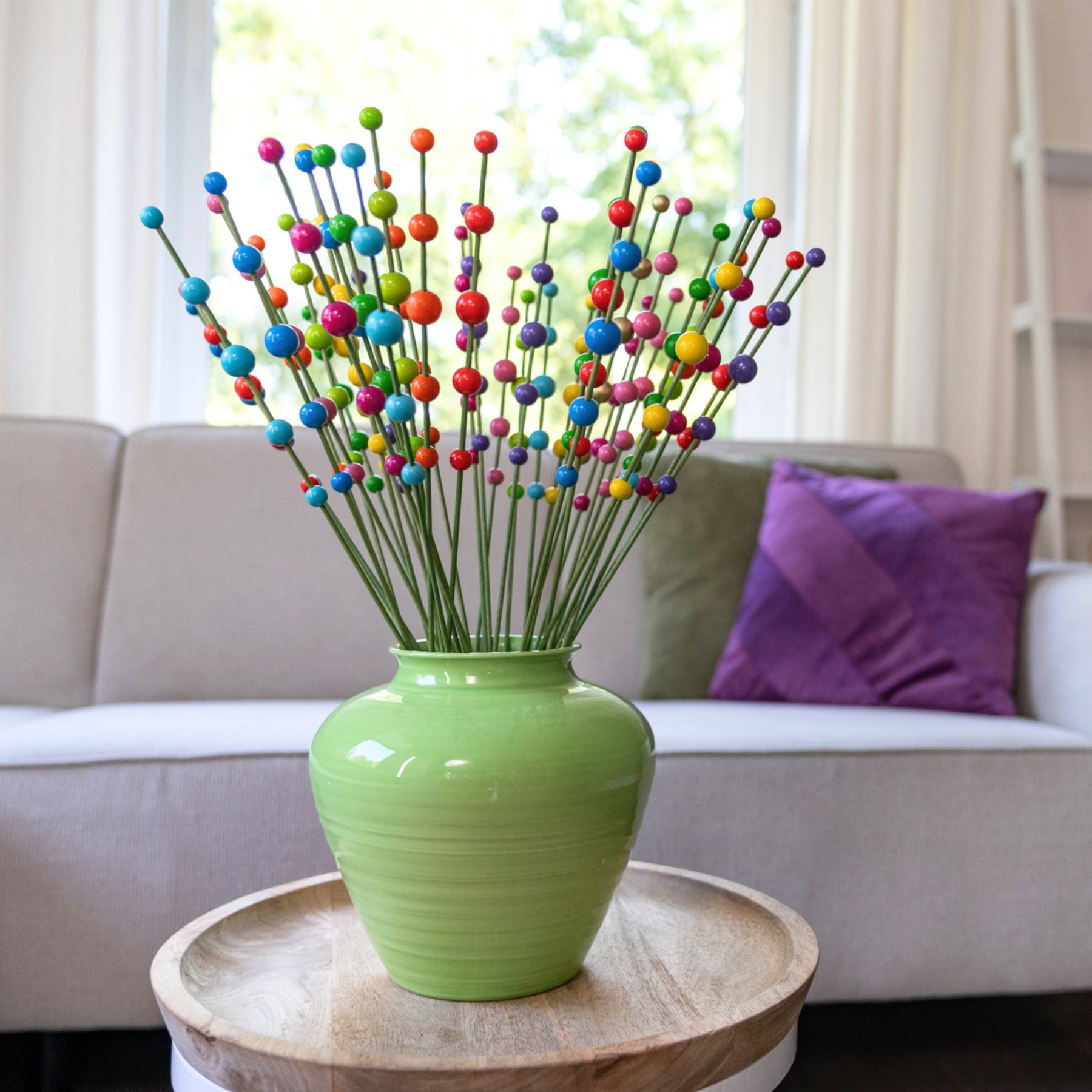 | Kleuren | Geel, oranje, rood, roze, fuchsia, lila, appelgroen, groen, blauw en turquoise. En 1 steel met gouden bolletjes. Groene stelen |