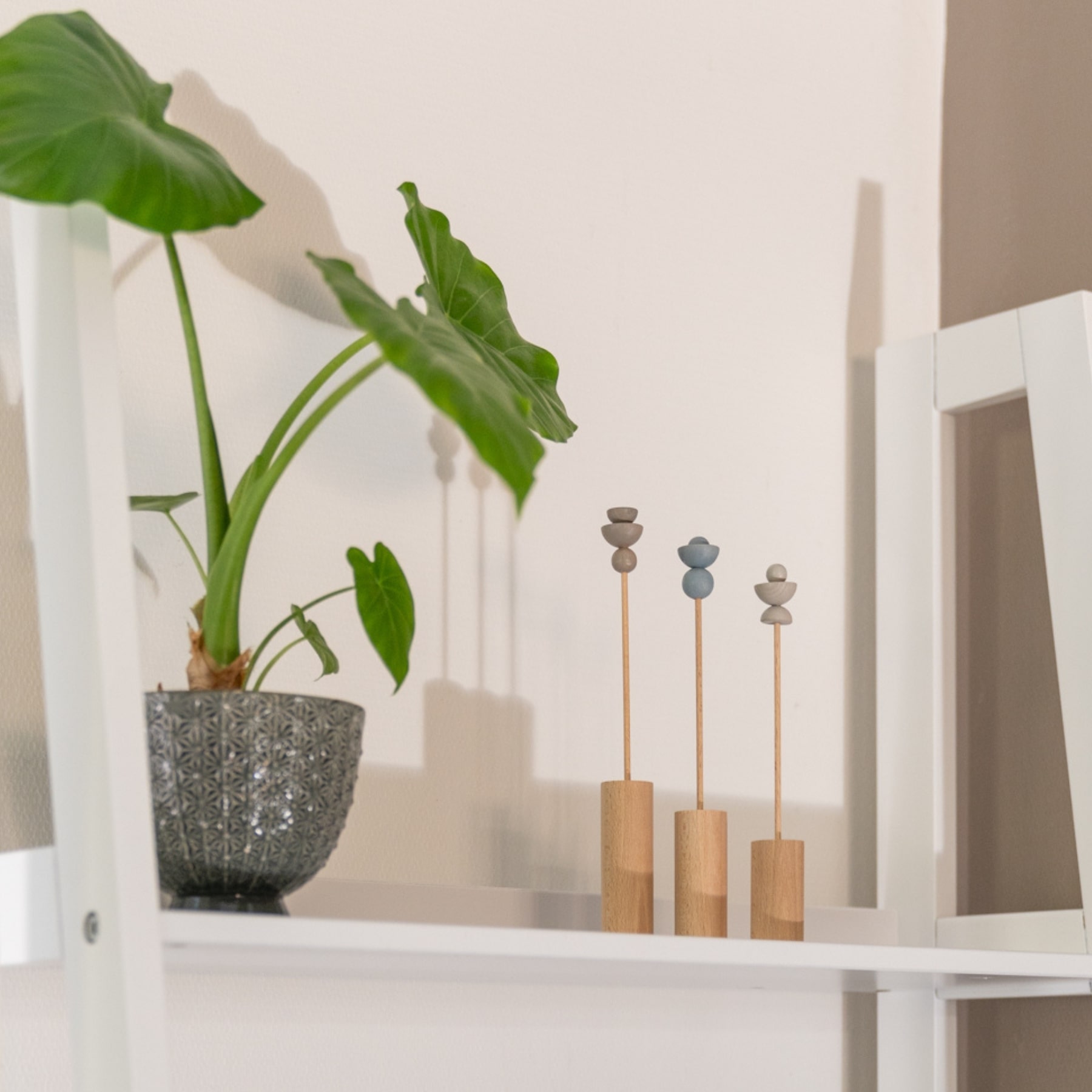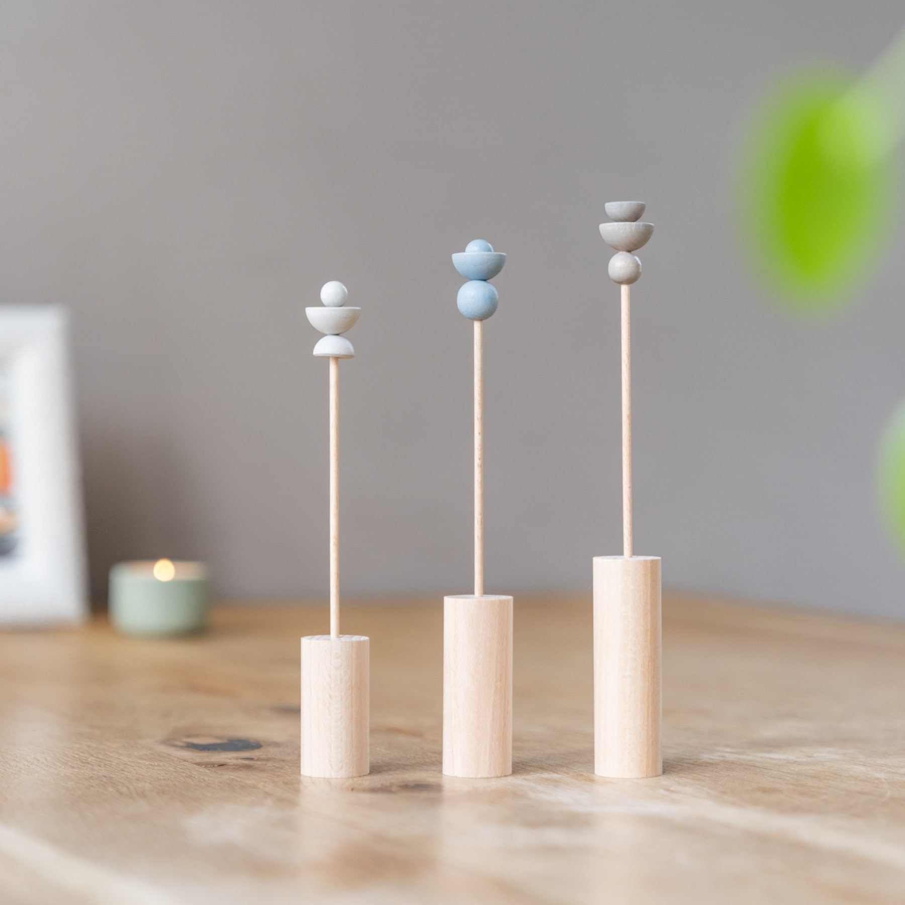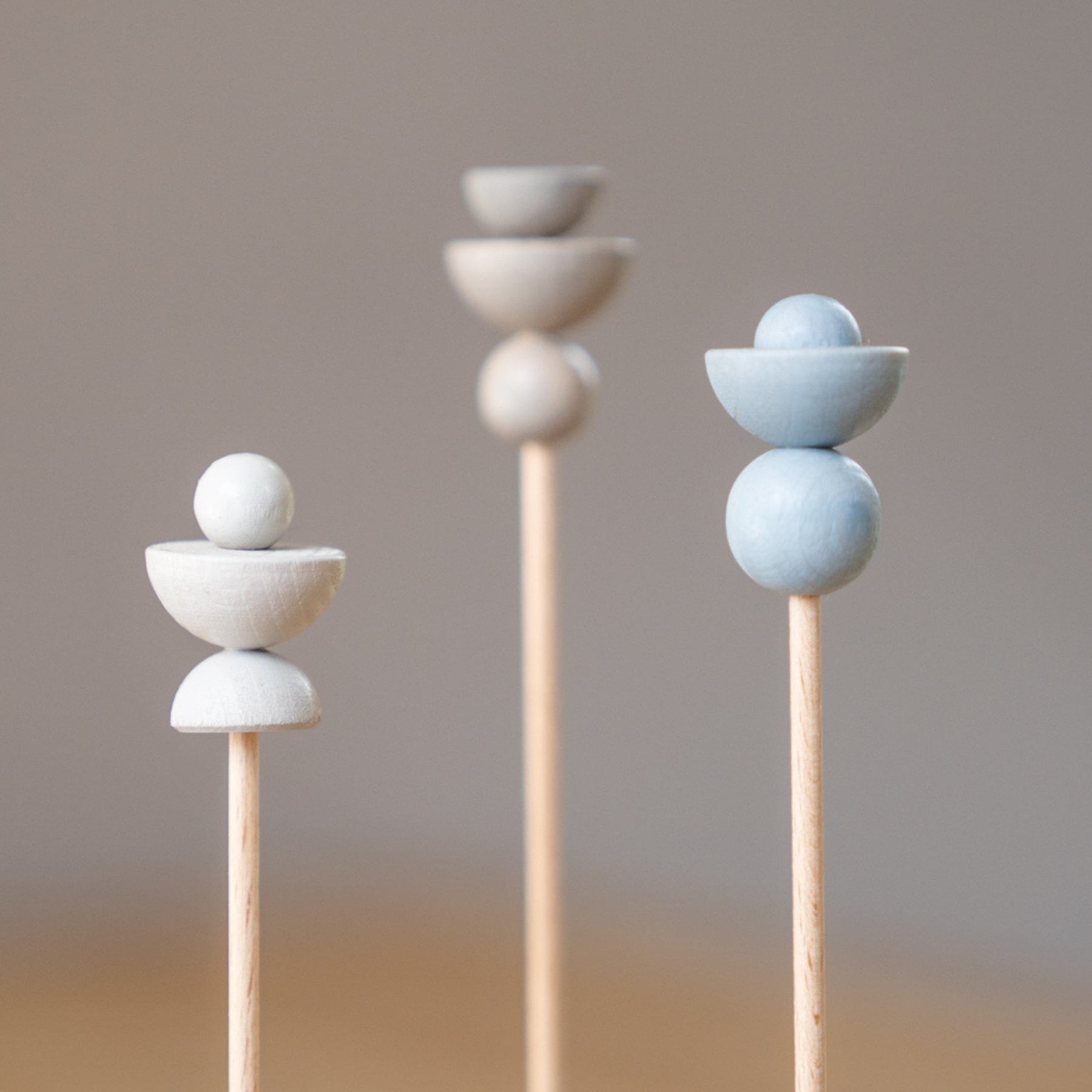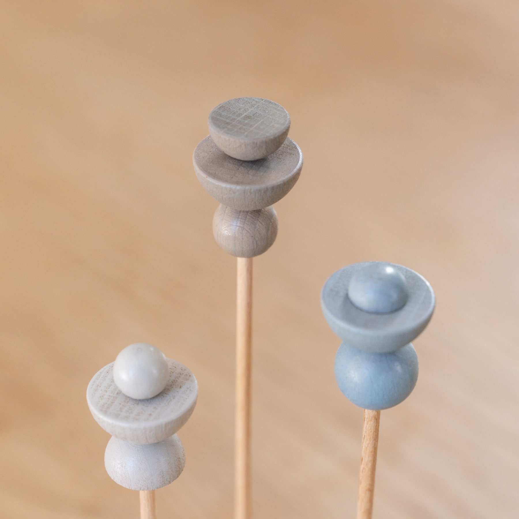Het ideale brievenbuscadeau! Deze set bestaat uit 3 stijlvolle houten voetjes en 3 unieke houten bloemetjes. Zowel de voetjes als steeltjes zijn van naturel, onafgewerkt, beukenhout. De bloemetjes zijn zijdeglans/mat afgewerkt in de kleuren warm licht grijs, warm grijs en ijsblauw.