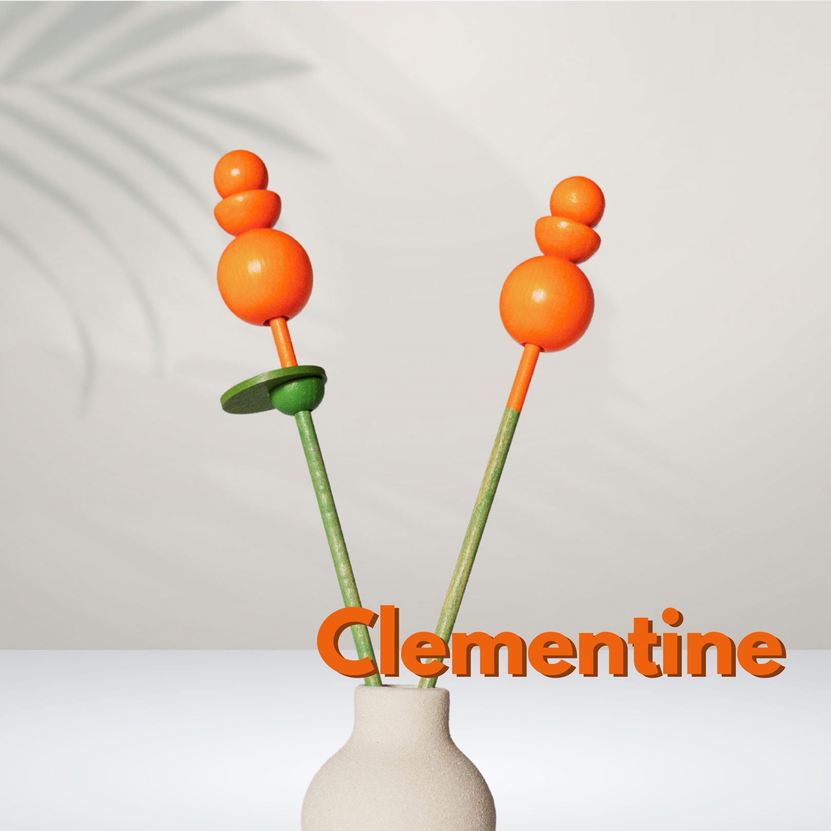 Clementine is oranje, wordt met de hand gemaakt en per stuk verkocht. Je kunt kiezen voor een variant met of zonder blad; helemaal afgestemd op jouw eigen stijl.