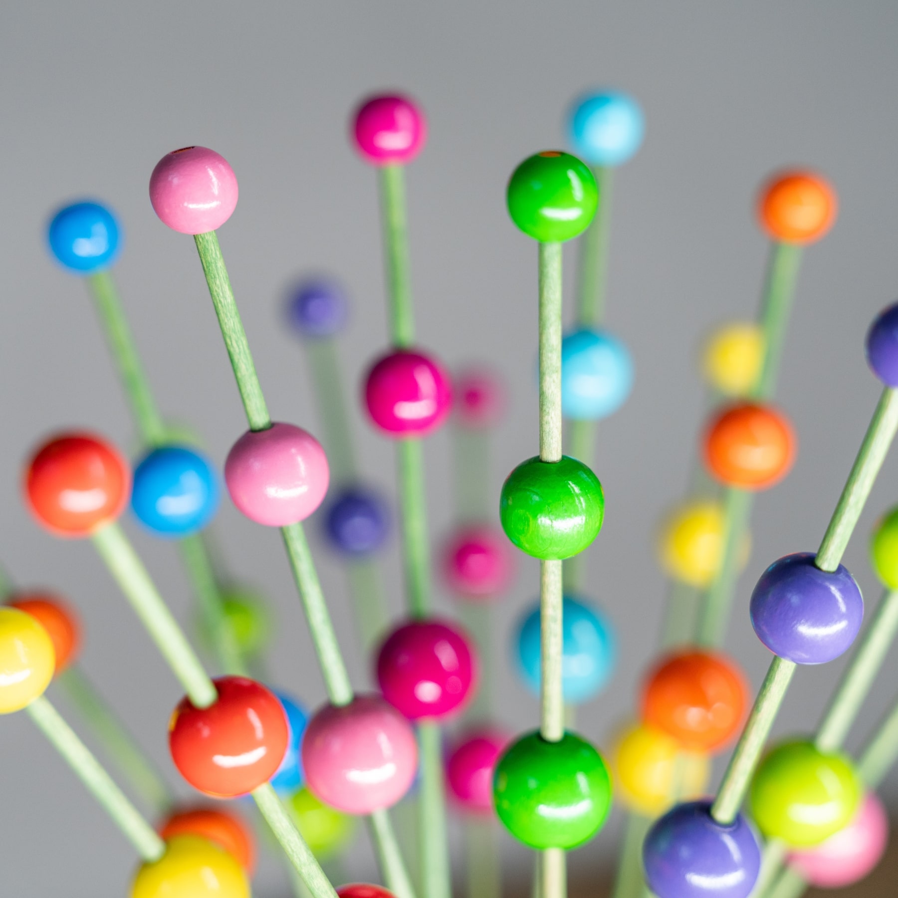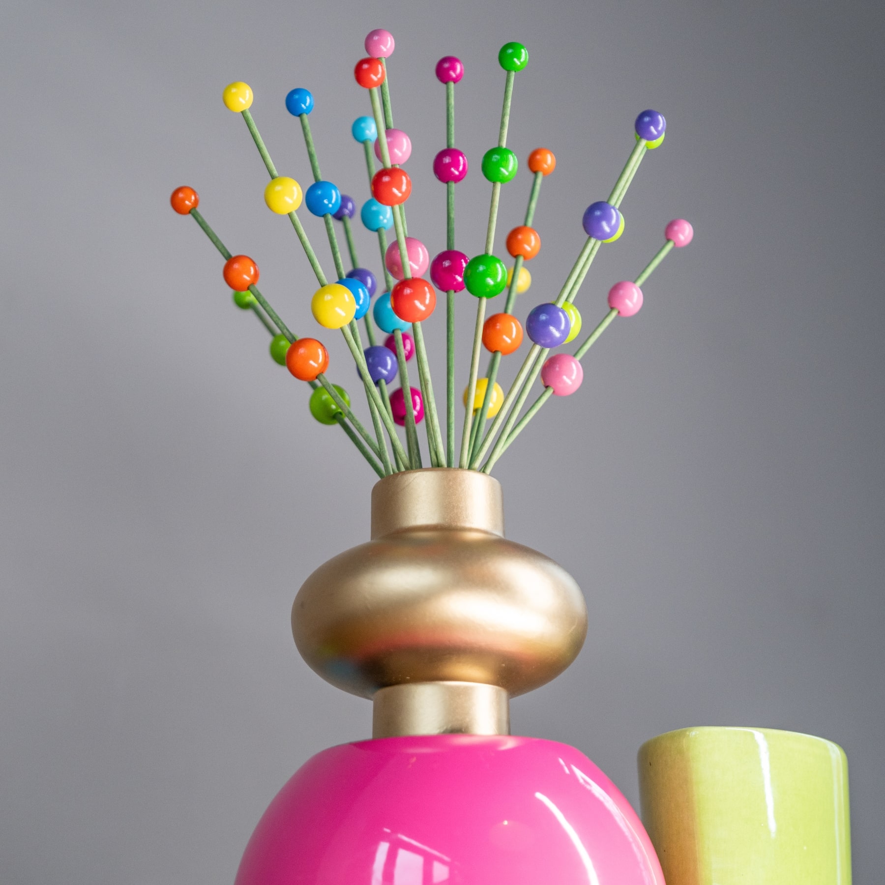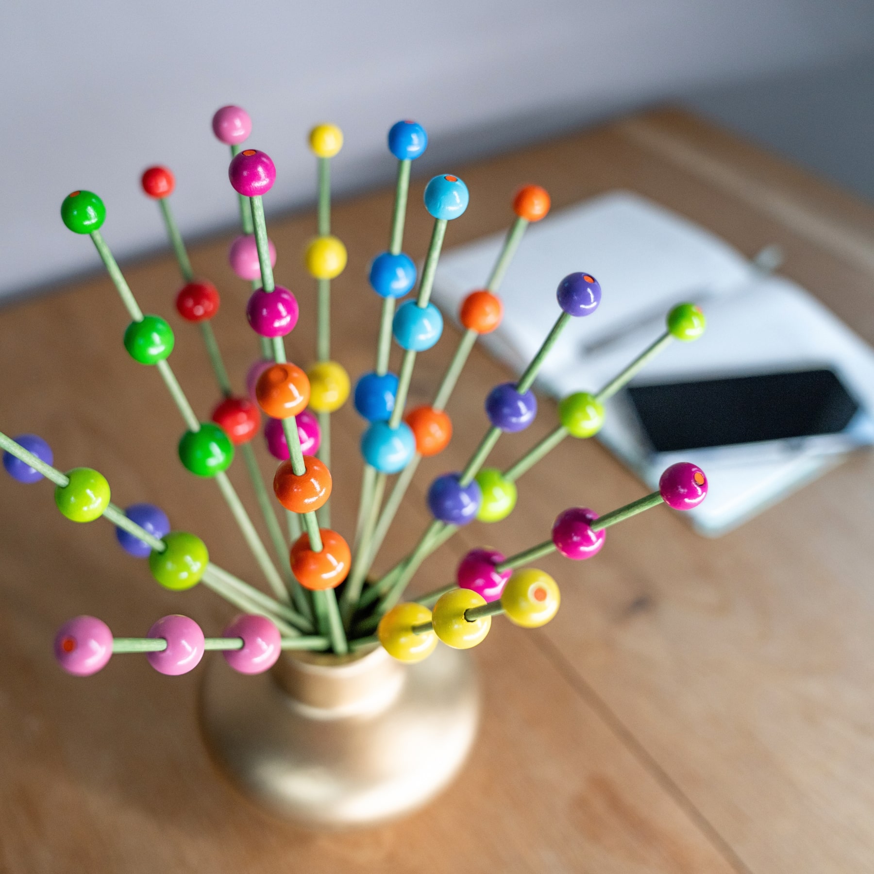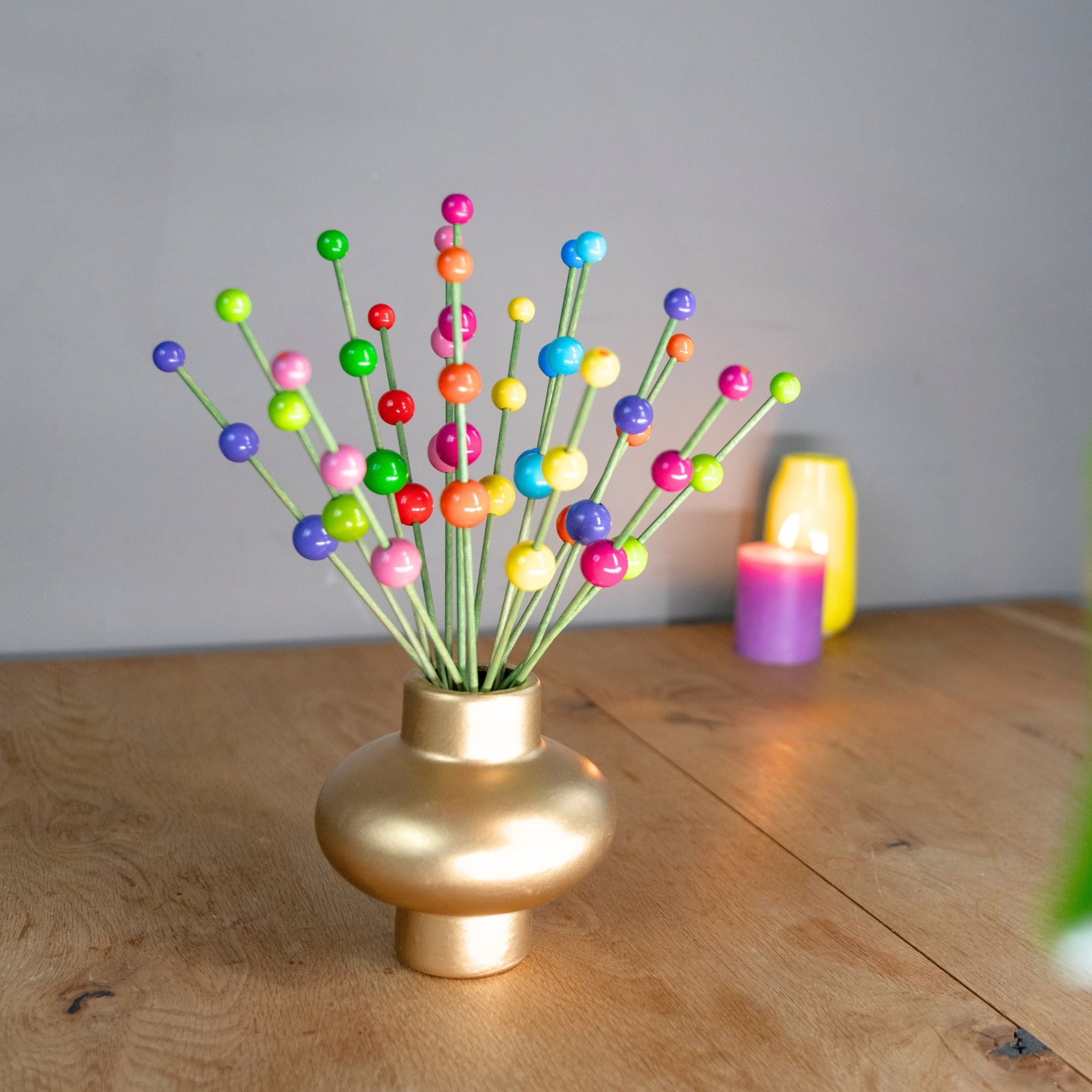 De 16 houten steeltjes met houten bolletjes staan stevig in het gouden aardewerk vaasje door het schelpenzand.
